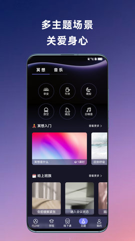 冥想作为一种古老的修行方式,通过调整呼吸和专注思绪,可以帮助人们释放焦虑,提升能量,改善睡眠质量,甚至探索自我内心深处。FLOW冥想应用提供了丰富多样的冥想课程和指导,帮助用户在繁忙的生活中找到片刻宁静和放松。通过FLOW冥想应用,用户可以随时随地进行冥想练习,无需专门的场地和时间安排,只需打开手机或平板电脑,即可享受到冥想的益处。无论是在家中、办公室、甚至是在户外,只要有手机在手,就能随时开始冥想之旅。