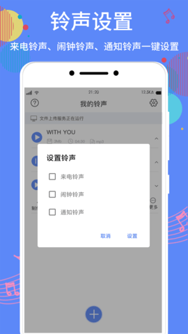 用户还可以自由剪辑铃声,根据自己的需求自定义短信铃声、手机铃声和闹钟铃声的音乐长度,让曲目随心变。