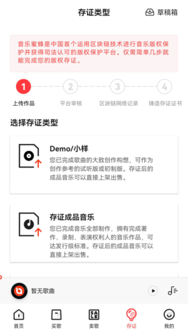 音乐蜜蜂是一款具有创新意义的在线音乐应用,其独特之处在于其支持多种格式的免费存证,包括音频、歌词、曲谱、MIDI等,这使得用户可以方便地确权并保护自己的作品。在音乐蜜蜂上,用户可以先确权后交易,将存证作品上架市集并自主定价,保证版权清晰,买卖无忧。