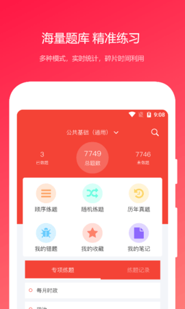 除了专项章节练习和重要讲话试题,公共基础真题还包含了随机测试、模拟考试、错题记录等功能。
