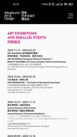 活动导览和地图信息是西岸艺博为用户提供的便利功能,用户可以通过应用轻松找到展览的位置,规划行程。