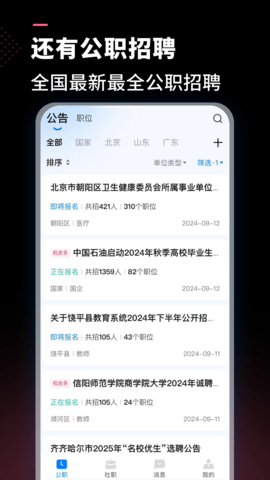 公聘整合了社职与公职信息,用户可以在同一平台上获取多种工作机会,方便求职者进行选择。