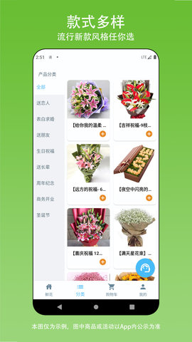 提供丰富多彩的花束、花篮、绿叶及商务用花,满足不同用户的需求,场景选择多样。