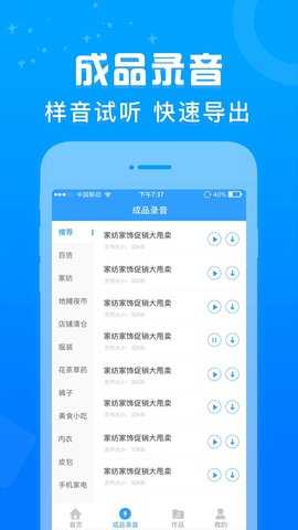 该应用的核心功能之一是多人配音,用户可以选择男声、女声或混合配音,满足不同场景的需求。用户还可以同步导出MP3和歌词文件,方便在多平台分享给好友,提升配音作品的传播效果。促销广告配音还是一款文字转语音配音软件,用户只需输入文字,即可轻松转换为语音。这一功能广泛适用于商场店铺广告促销配音、地摊叫卖录音制作、有声朗读等多种场景,为用户提供了更多的选择。