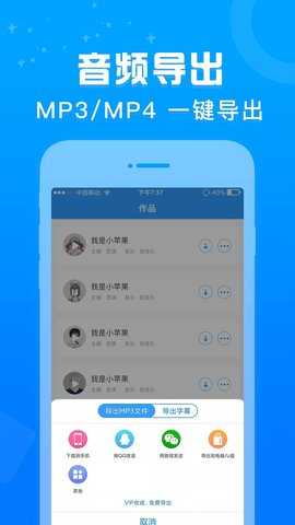 该应用还具有一键导出功能,用户可以将配音作品导出为MP3文件,方便拷贝到U盘或内存卡中播放,实现更便捷的分享和传播。