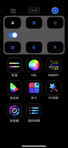该软件支持多种灯光分组控制,用户可以选择A、B、C、D、E、F等分组,轻松管理不同的蓝牙摄影灯,提升工作效率。