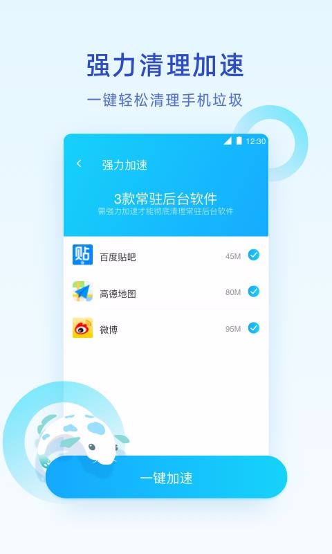 一键加速功能:通过快速识别常驻运行的应用,轻松选择加速,提升手机运行速度。