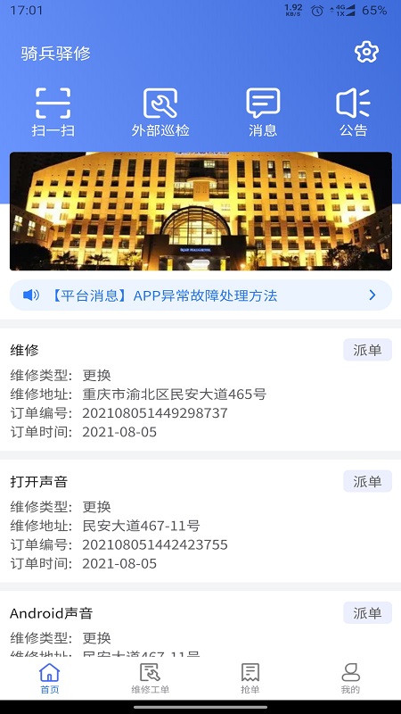 通过骑兵驿修平台提交报修请求,系统会自动将订单分配给附近的维修师傅,确保快速响应。