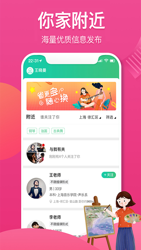 通过输入地址信息,快速找到500米范围内的艺术老师,方便快捷。