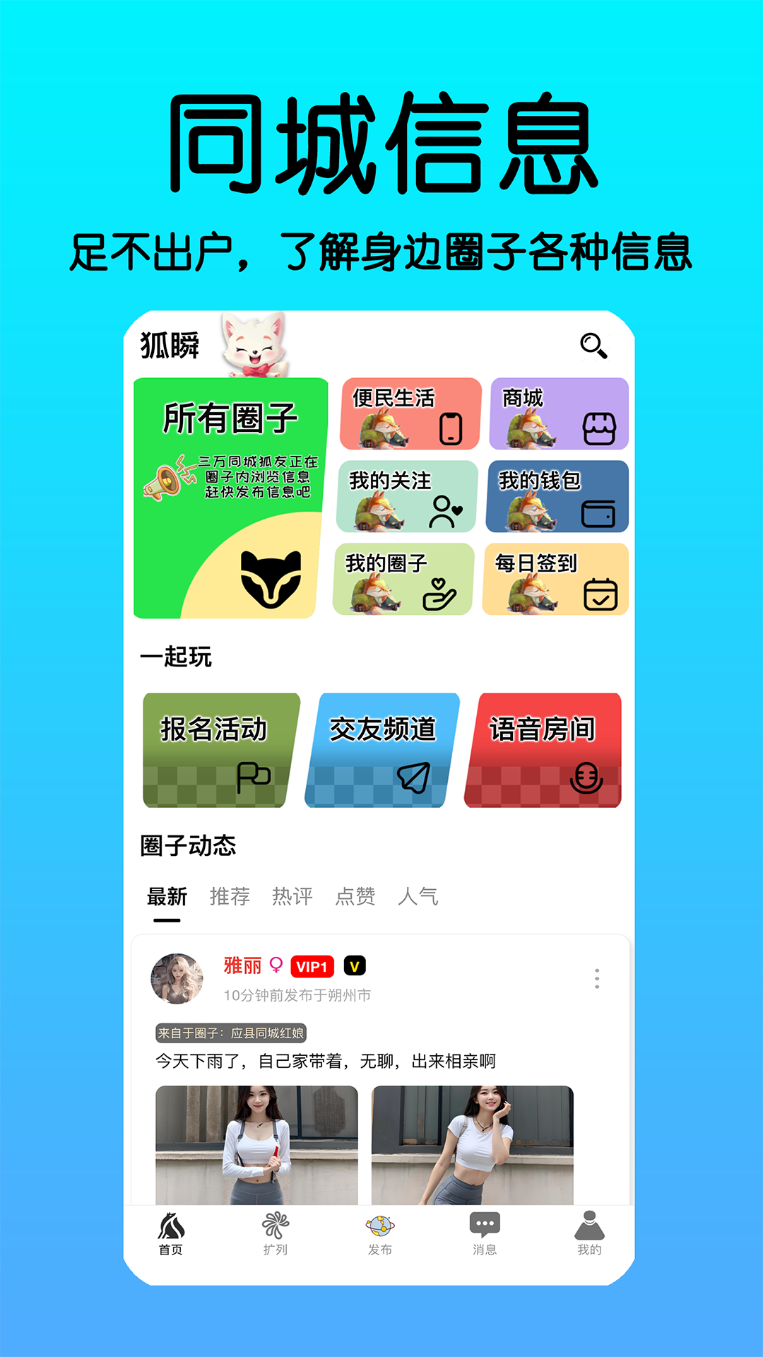 狐瞬软件满足年轻人对信息获取和社交互动的需求,特别关注那些希望在本地社区中找到机会与连接的用户。我们的平台汇聚了丰富的本地资源,通过技术手段提升用户的生活质量和社交体验。品牌的核心理念是连接与分享,我们希望通过这个平台让每个人都能轻松获取信息、交友、找工作,甚至参与到本地的商业活动中来,成为社区的一部分。