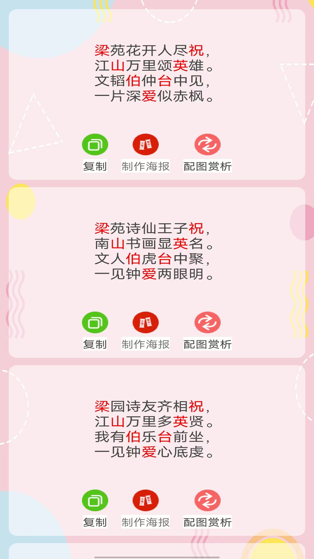 个性化定制:根据自己的需求,输入不同的姓名或关键字,软件会自动生成符合主题的藏头诗,让每一首诗都充满个性。