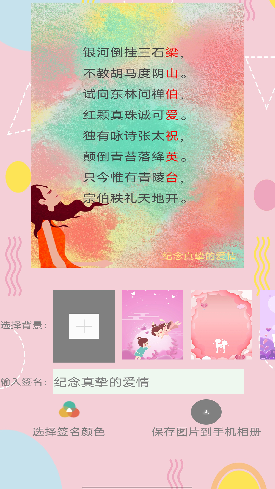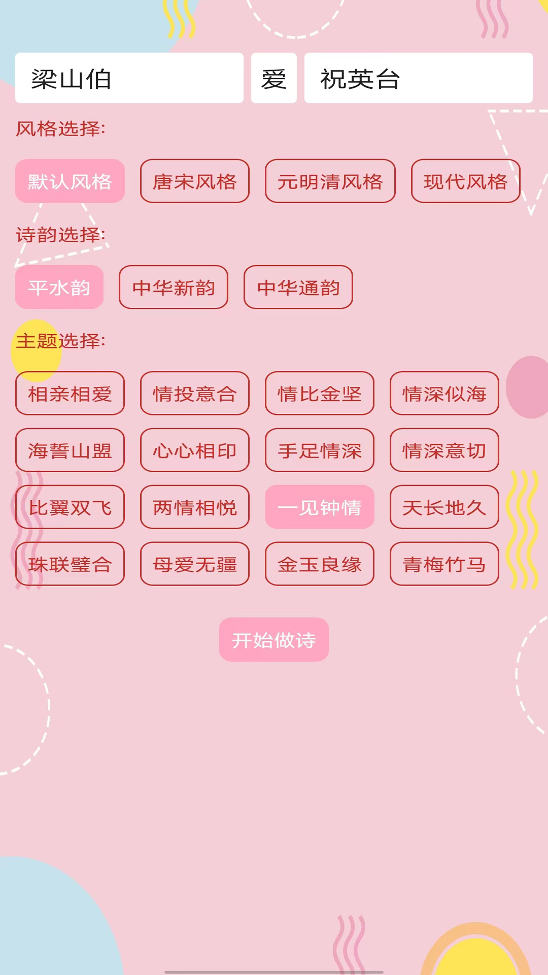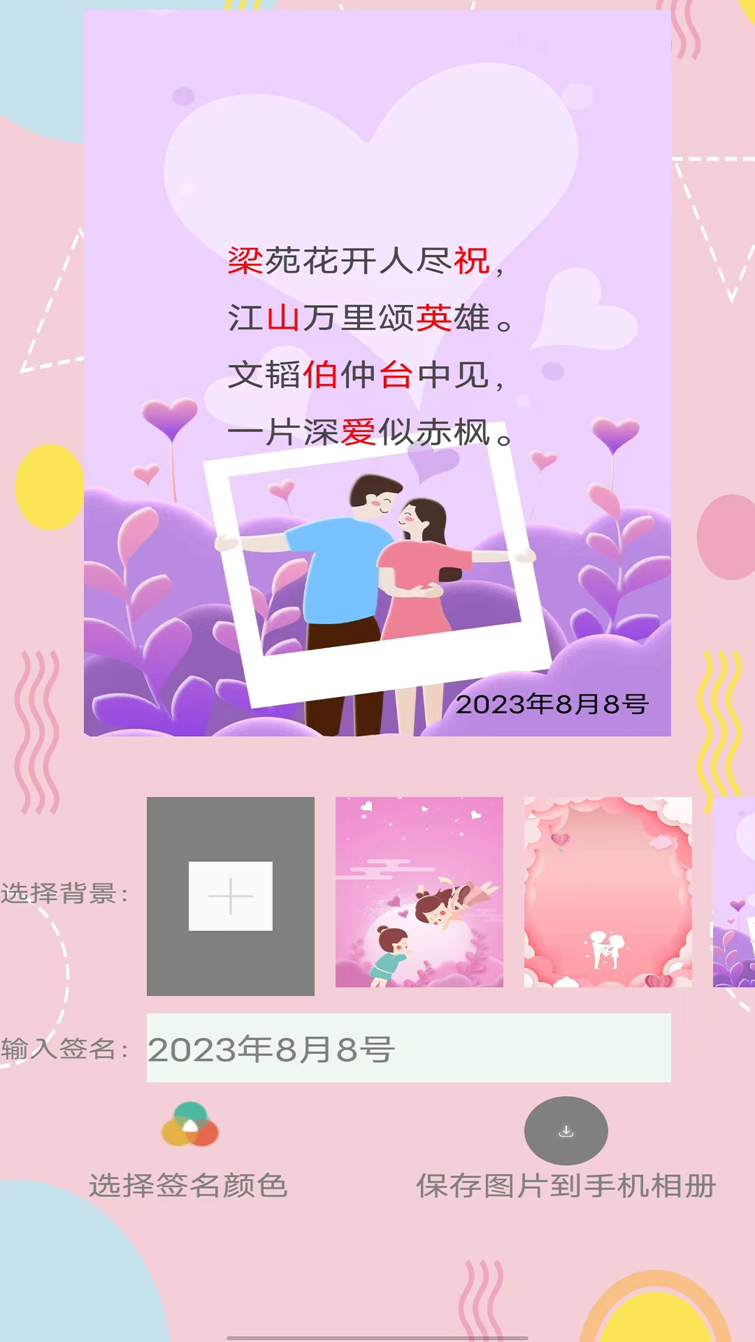 爱情藏头诗:用户只需输入两个人的姓名,软件便会生成专属的爱情藏头诗,帮助你在表白时更具创意和诚意,瞬间打动对方的心。