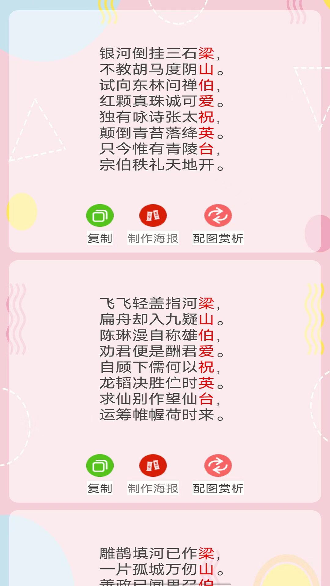 分享功能:生成的诗句可以直接分享至社交平台,帮助用户将自己的创意和情感与朋友们分享,增加互动乐趣。