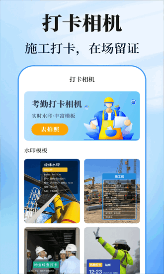 4. 水印打卡记录:拍照时自动添加时间、地点等信息,确保拍照记录的真实性,为工地管理提供支持。