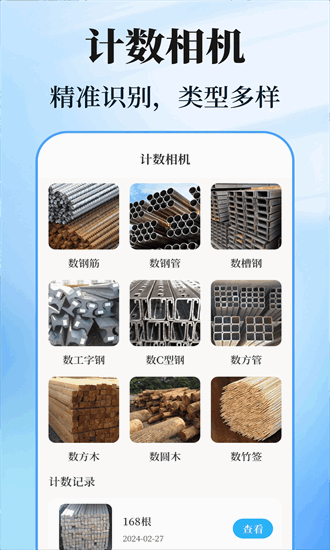 数钢管计数相机是一款专为建筑行业打造的智能应用,简化工地上的计数和测量工作,用户只需轻松拍照,系统便会迅速识别并给出准确的数量。这款应用不仅能够提高工作效率,还能为工程师、建筑工人和测量师等专业人士提供极大的便利集成了多种实用工具,成为了每位从业者不可或缺的得力助手。