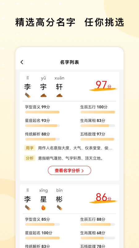 4. 免费获取高分名字:轻松获取90-100分以上的名字,确保每个名字都是经过严格筛选的精品,满足用户对名字的高标准要求。