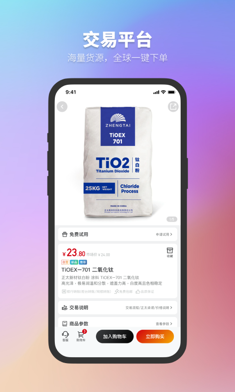正太化学是一款推动化工行业数字化转型的创新软件。仅是一个交易平台,更是一个连接全球化工产业上下游的生态系统。在这里找到一线大牌的化工产品,享受高品质的保障。正太化学通过提供样品试用服务,帮助客户快速了解产品,降低采购风险。具备强大的数据分析能力,帮助用户在复杂的市场环境中做出明智的决策,真正实现了智能化的化学品采购体验。