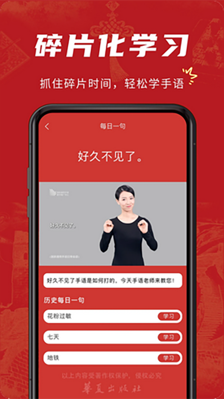 4. 逐步上线的华夏出版社有限公司手语学习资源,为用户提供丰富的学习内容,帮助他们在不同场景中应用手语。