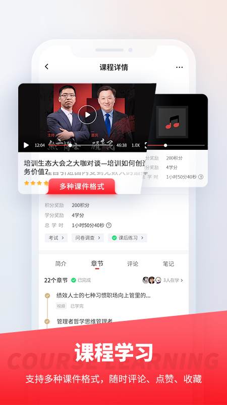 2. 平台提供多种课程形式,包括视频、文档、H5等,支持多样化的学习方式,帮助员工在不同场景下灵活学习,满足不同学习习惯和需求。