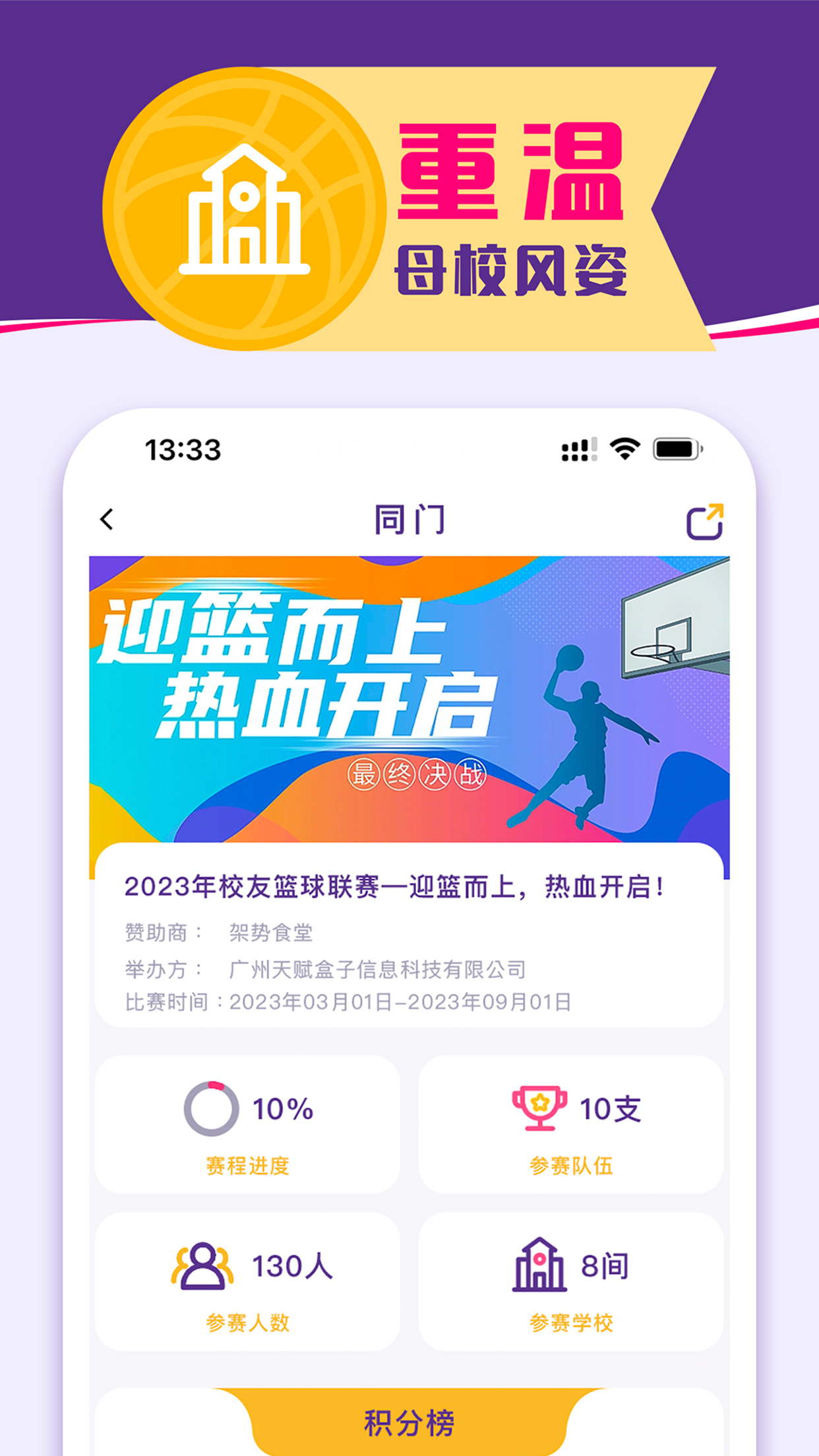 天赋同门是一款专为初、高、中职校友打造的社群运动联谊综合平台。仅是一个运动软件,更是一个连接同窗情谊的桥梁。通过丰富多彩的运动活动和互动模式,帮助用户在锻炼身体的重温校园时光,增进彼此之间的感情。无论你是想找老同学一起打球,还是想参加组织的运动活动,这里都能满足你的需求让运动变得更有趣,更有意义,真正实现了运动+社交的完美结合。