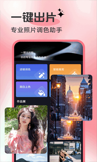 一键出片啦是由合肥灵境互动科技有限公司推出的一款专为摄影爱好者和创意工作者打造的图像处理应用,提供一种高效、便捷的方式来优化和美化照片。软件着力于简化复杂的修图流程,让你能够快速实现理想的视觉效果。告别繁琐的操作,一键出片啦让你专注于创意本身,轻松创作出令人惊艳的作品。应用内建多种专业级工具,并支持个性化调整,满足你对图片处理的各种需求。如同你的掌上工作室,随时随地捕捉和呈现美好瞬间。