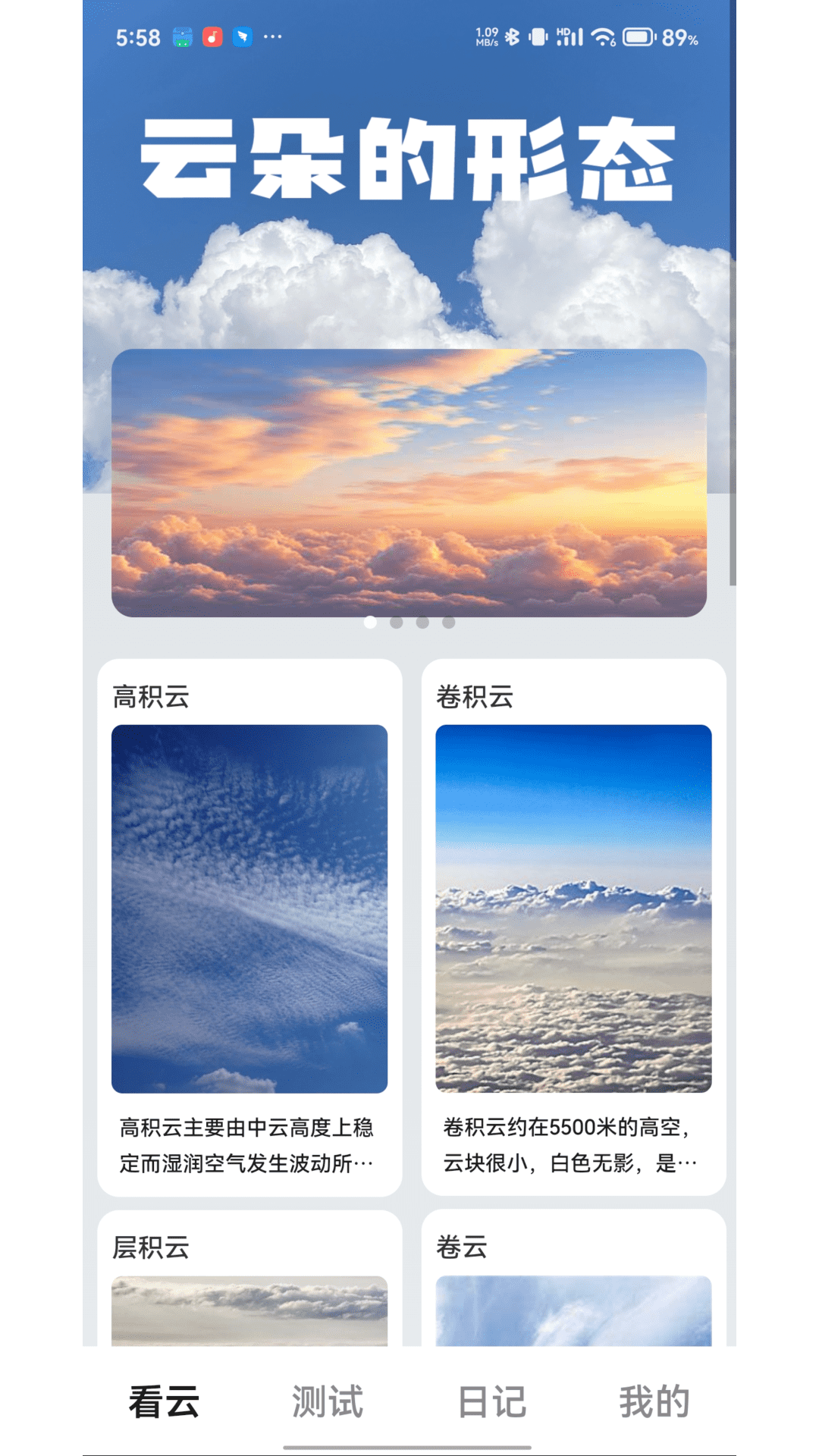 1、通过看云模块,详细了解各种云的特性与分类,激发对自然的热爱。