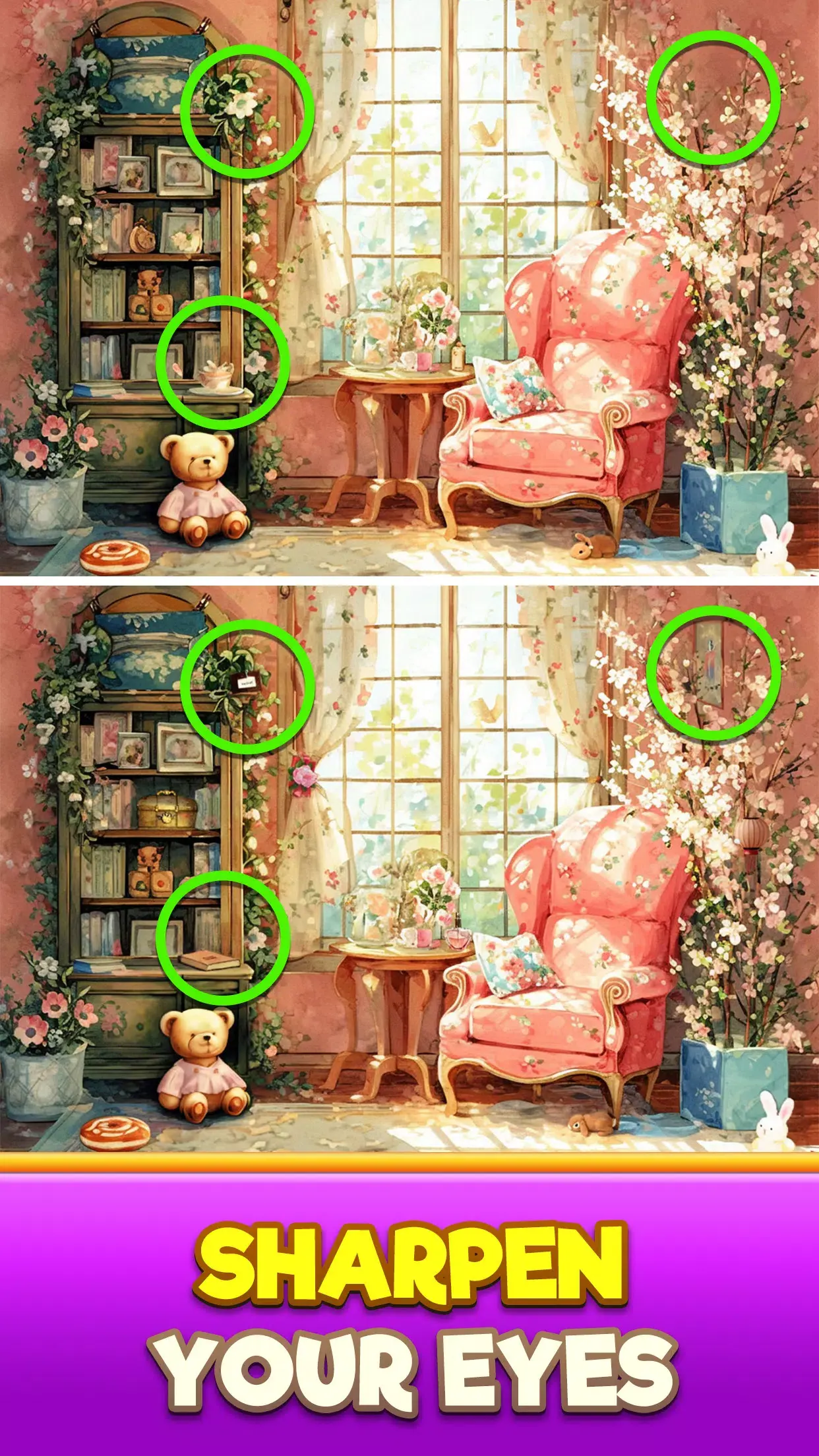 Differences是一款别出心裁的益智游戏,巧妙地将经典的找不同玩法与温馨的家居重建主题融为一体。玩家将化身眼力超群的侦探,细致入微地观察两幅看似相同的图片,找出细微的差异,通过智慧和观察力来逐步修复并装饰自己的梦幻家园。