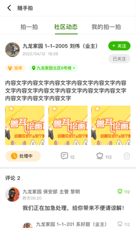 随手拍功能鼓励业主记录社区的点滴变化,物业管理人员可以通过这些反馈进一步改善社区环境。