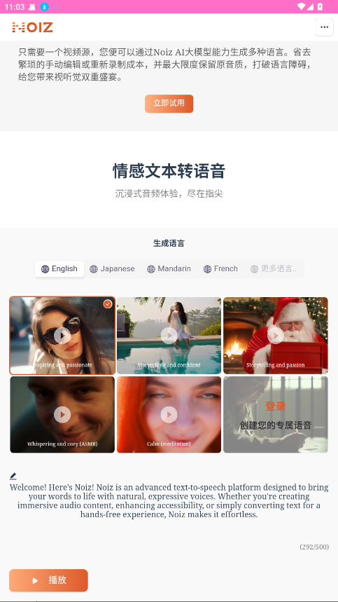 NoizAI克隆是一款创新的音频创作工具,其独特之处在于能够利用人工智能技术,将普通的声音转化为可反复使用的数字资源。通过分析用户上传的短音频样本,工具可以构建出高度逼真的个人声音模型。此模型能够应用于多种场景,如短视频制作、有声书配音、个性化语音助手定制等。它为内容创造者与音频爱好者开辟了全新的创作领域,有效降低了专业配音的需求门槛,让声音成为一种更具表现力与个性化的表达形式。