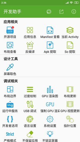 它可以用来反编译其他应用、查看其他应用的布局和控件信息、屏幕取色、查看Activity的历史记录、查看其他应用的Manifest文件、查看最近使用和最近安装的应用、提取任何应用的Apk和So文件、查看最新的开源项目、调试应用、查看手机软硬件信息等。