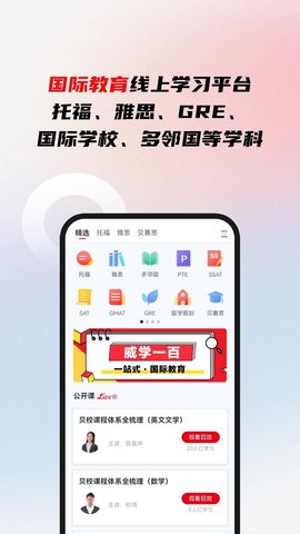 威学一百网校是一款专注于雅思、托福、GRE以及国际院校、海外高校课程等国际教育领域的在线学习平台。该平台为学生提供全方位的学习支持和服务,包括答题、背词、线上学习、视频课程以及直播教学等功能。