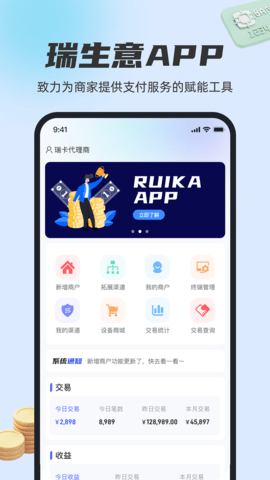 瑞生意是一款聚合支付数字化经营平台,致力于为商家提供全面的一站式支付工具选择。该平台不仅支持多种支付方式,还集成了进销存管理及收银管理系统,帮助商户高效地对接品牌商、经销商、门店及银行。通过瑞生意,商户能够实现数字化经营的全维度服务,从而提升运营效率,优化顾客体验,推动业务增长。