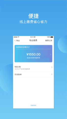 软件提供便捷的物业缴费功能,用户可以通过APP随时查询物业账单及停车月卡续费,简单明了。