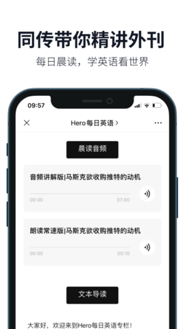 同传Hero功能让用户每天都能进行晨读,通过精讲国内外新闻,帮助用户在学习英语的同时,了解世界动态,拓宽视野。