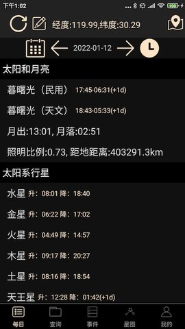 每日:显示每日的暮曙光、月亮的升落圆缺、可见恒星的升落、可见星座的升落以及messier天体的升落情况。