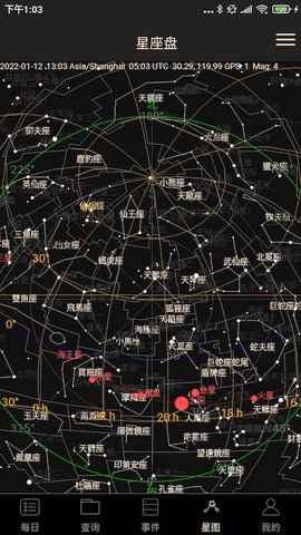 星图:展示星座盘,显示天体的位置、分布和运行轨迹。